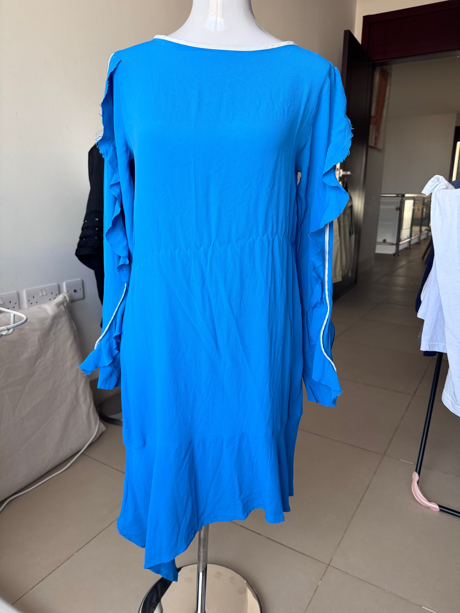 Details: The dress is a black, short-length style with a relaxed fit. The fabric appears to be silk, which gives it a luxurious drape. It has a unique design with a cinched, gathered detail on one side, which is a signature element of Proenza Schouler's deconstructed aesthetic.