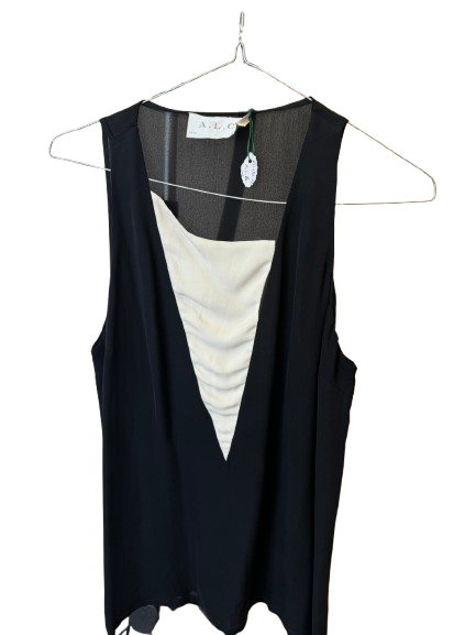 Basic black sleeveless top, enhanced with a bold triangle of white fabric on the front for a striking contrast.