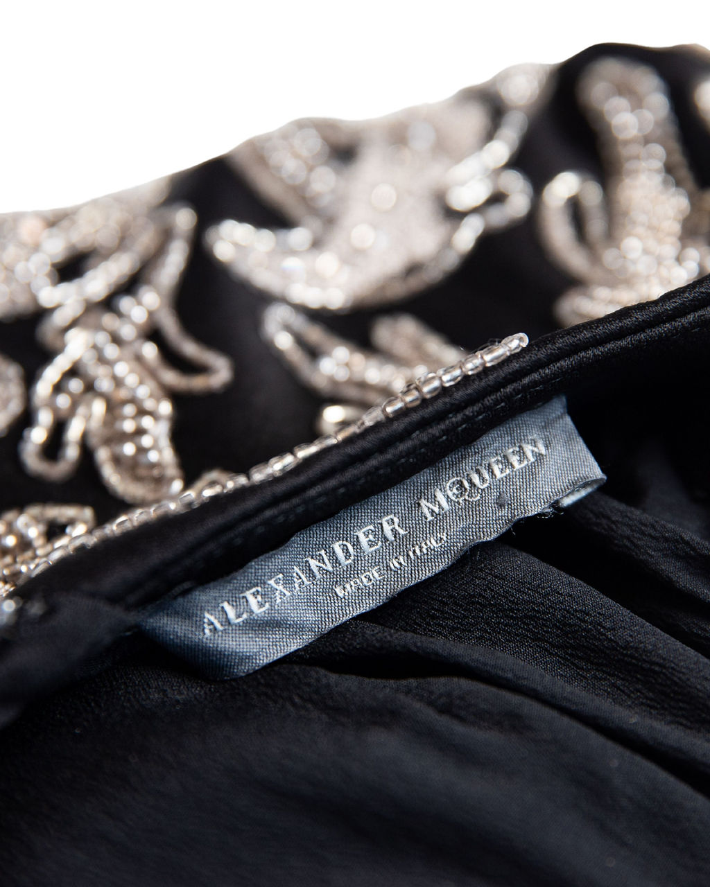 The gown is black, floor-length, with thin spaghetti straps. The bodice is heavily embellished with intricate beadwork and what appears to be embroidered or appliqué details in a silver/grey color. The fabric of the skirt appears to be a silk jersey or a similar drapey material.