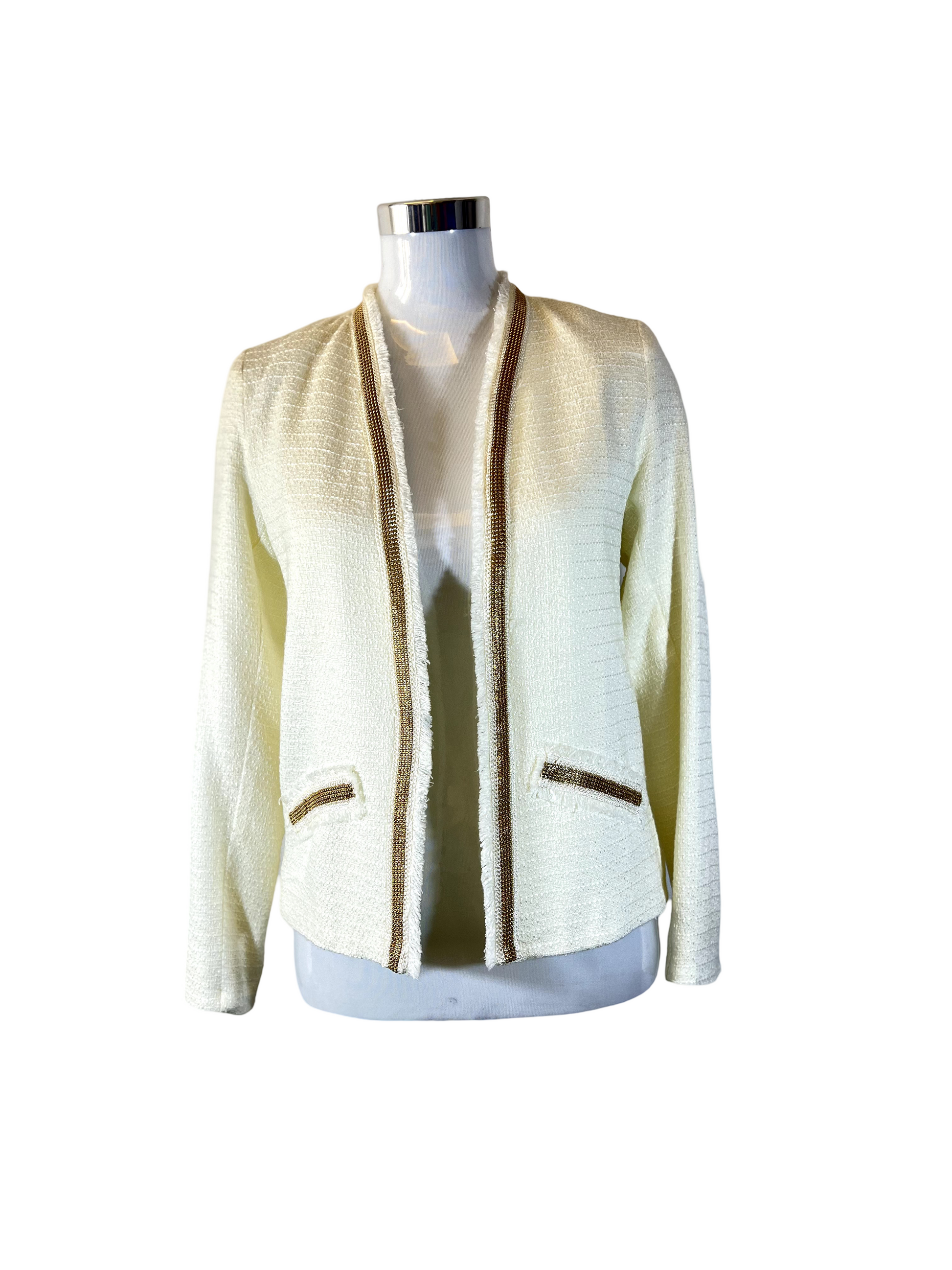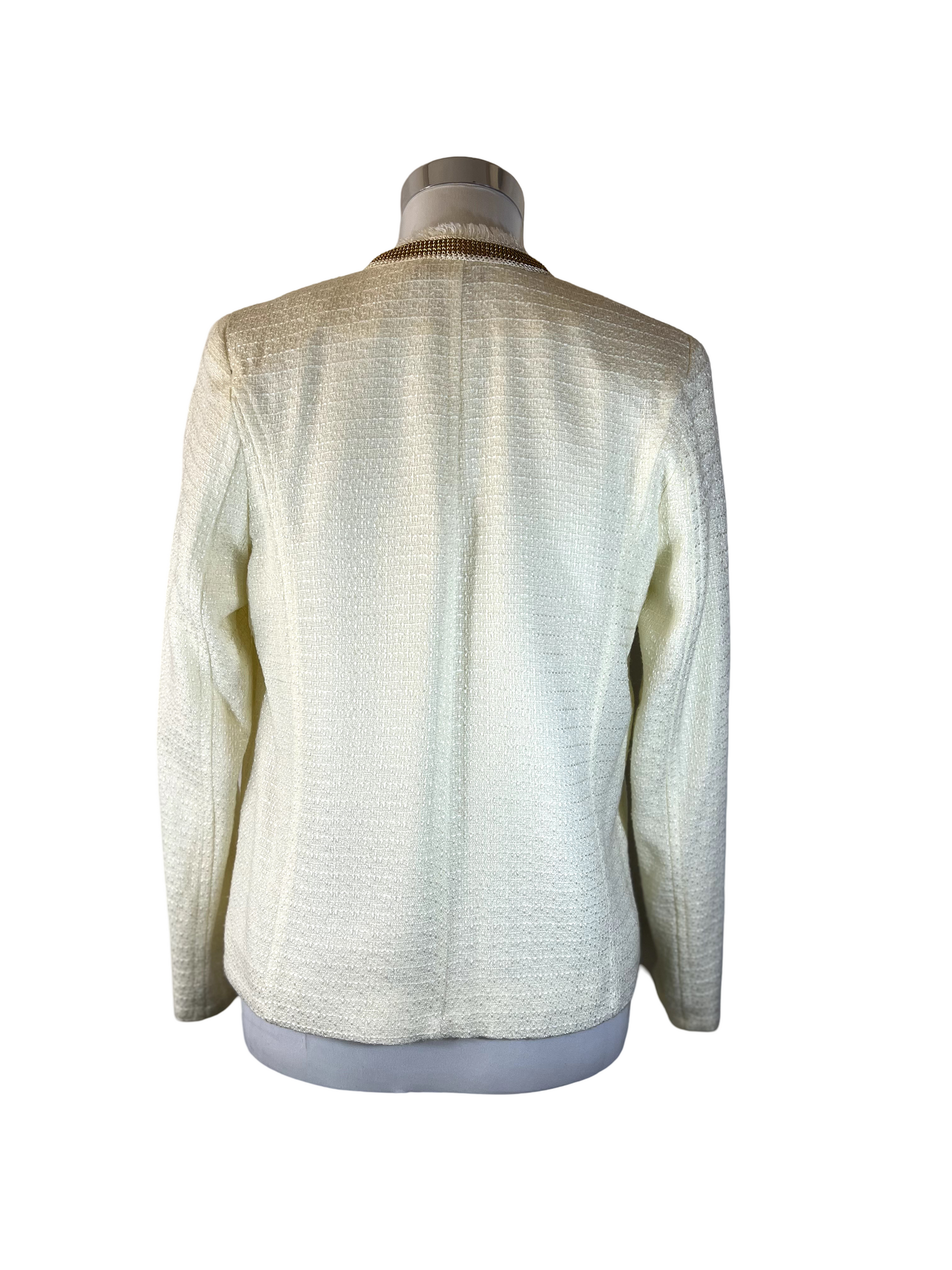 Cozy, channel-like fabric creating an open jacket silhouette, with a fine gold chain to add a touch of refinement and definition.