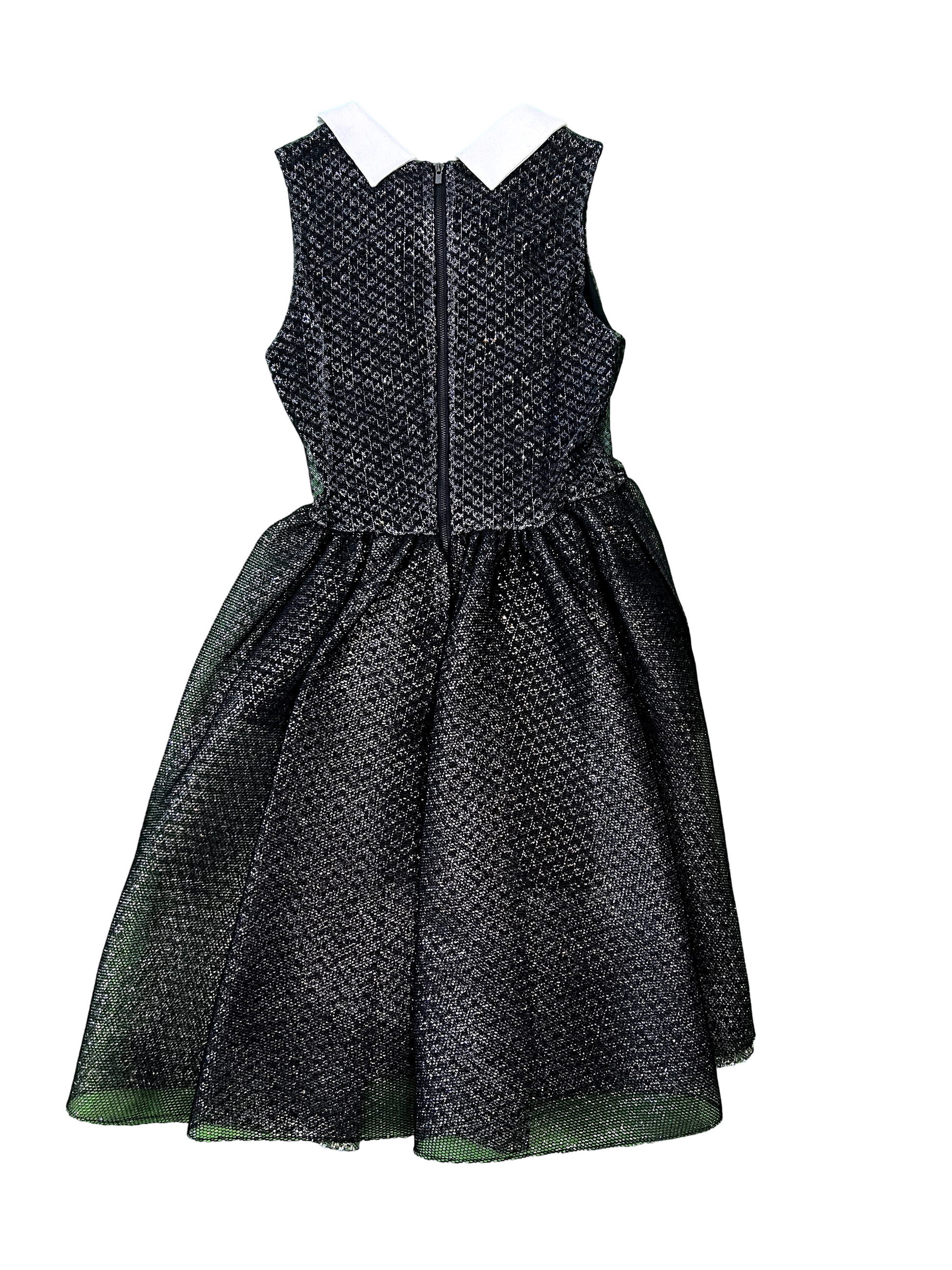 Black dress body hugging top part and puffed midi skirt like in suttle shine with a white colar.