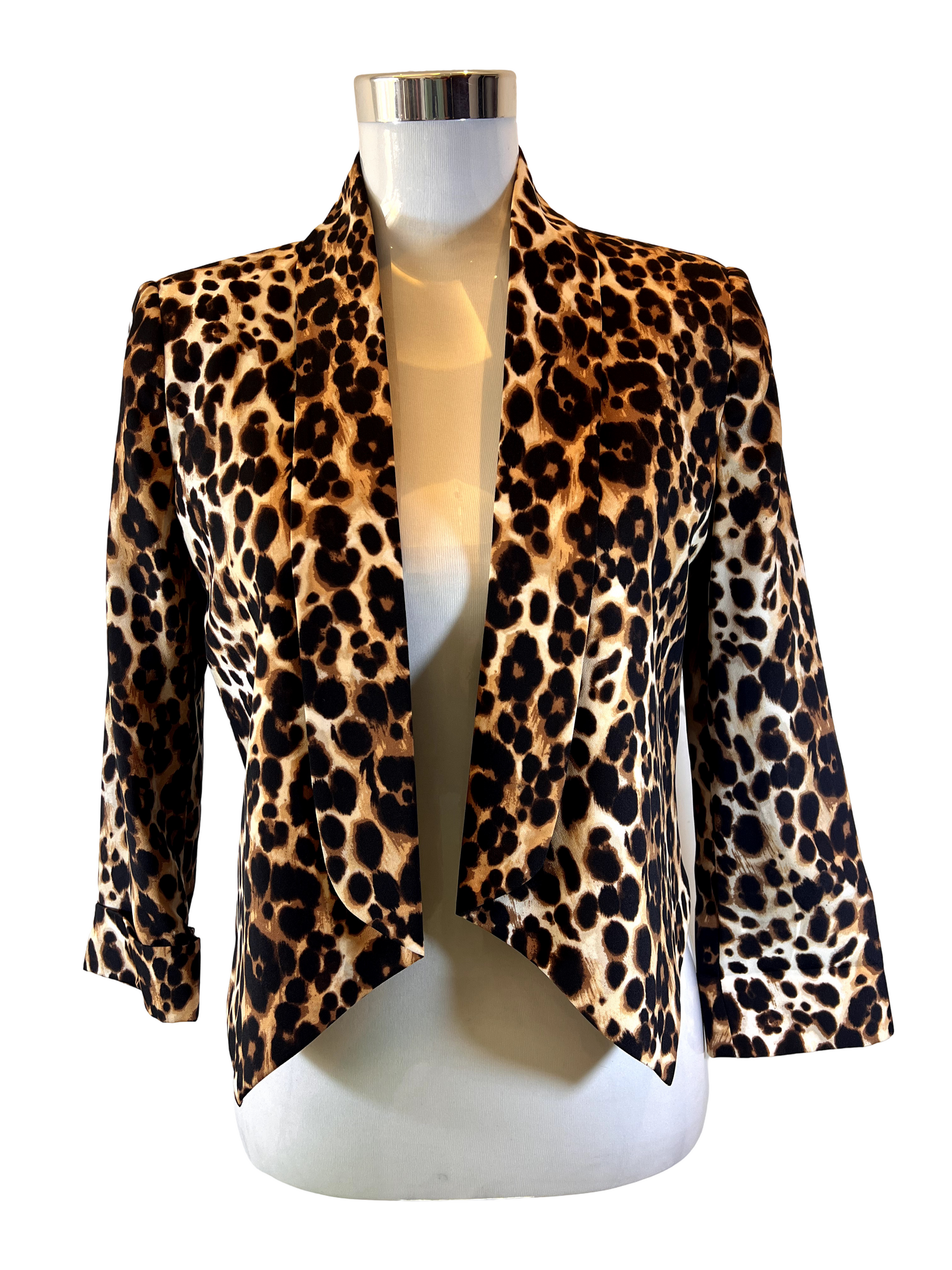 Eye-catching tiger print short blazer, crafted from light yet sturdy fabric for a bold, structured look.