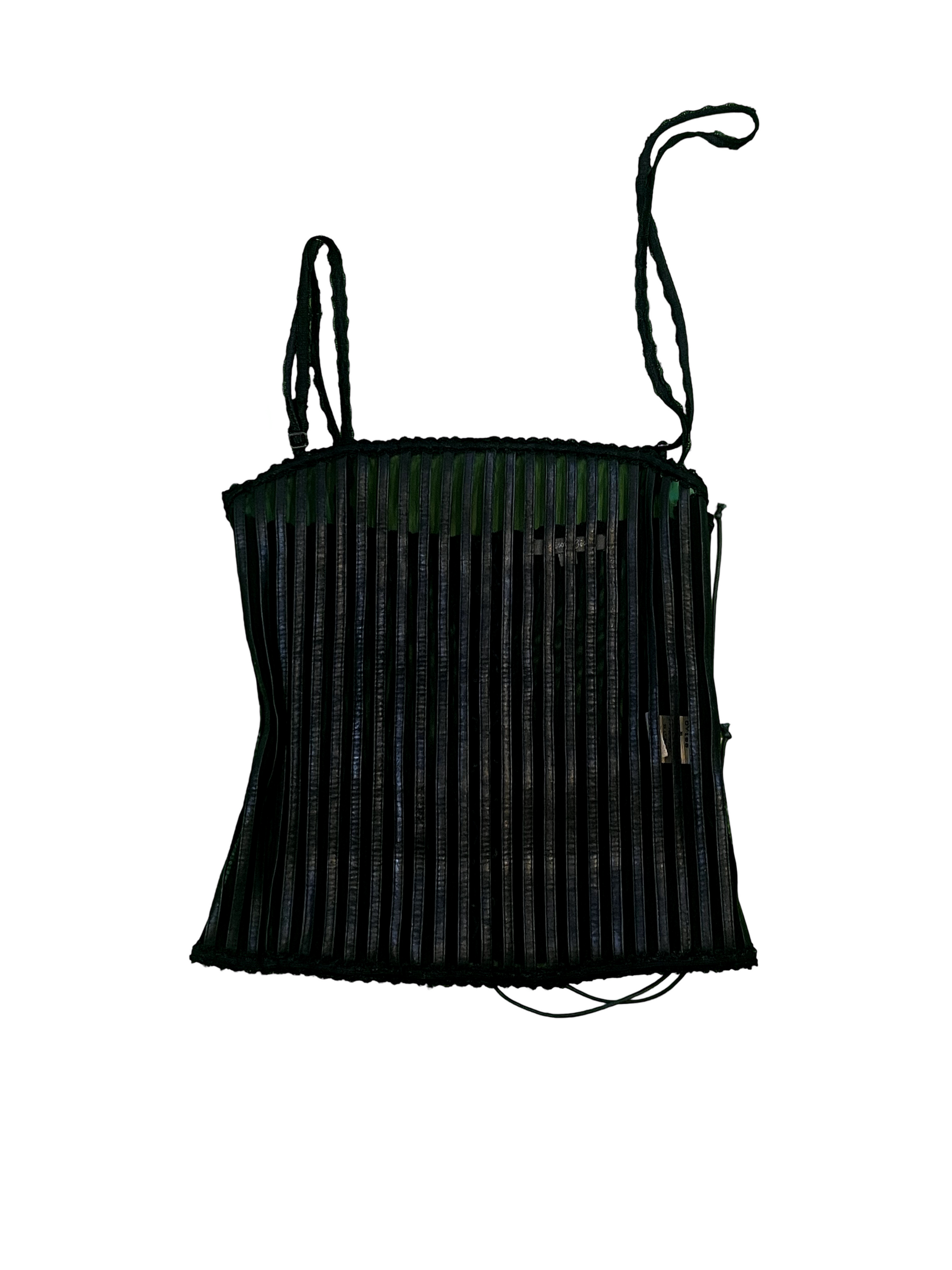Stylish twin top featuring a striped leather and chiffon design, with an inner corset-like top for added structure and flair.