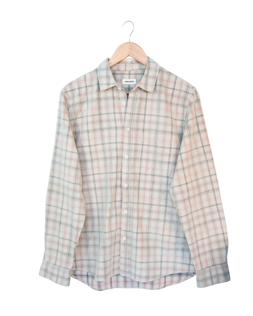Beige color base checked shirt by Zadig & Voltaire that looks like a thinly striped velvet fabric but is made from a 100% cotton material. Suitable for fall, winter, and, spring seasons.