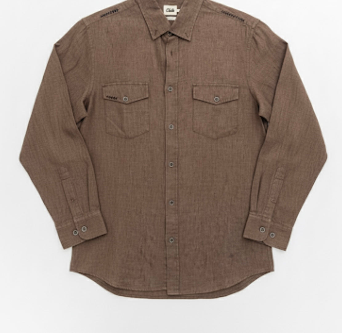 Lenin like fabric in brown with a stitch design on left shoulder and right pocket. Comfort fit
