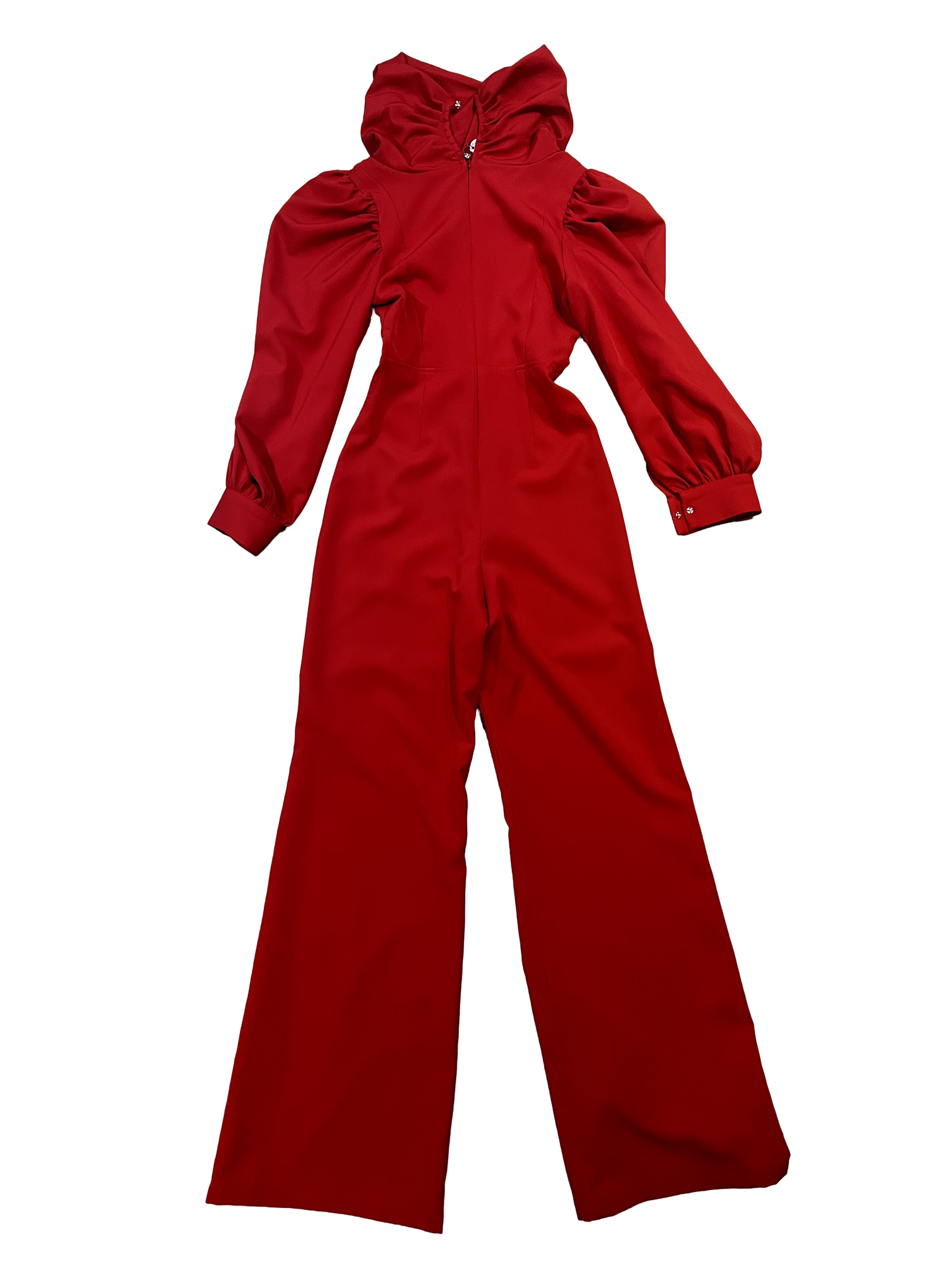 Red long jumpsuit, high colar & long sleeves with a twist. Suitable for any formal or valentine occasions.