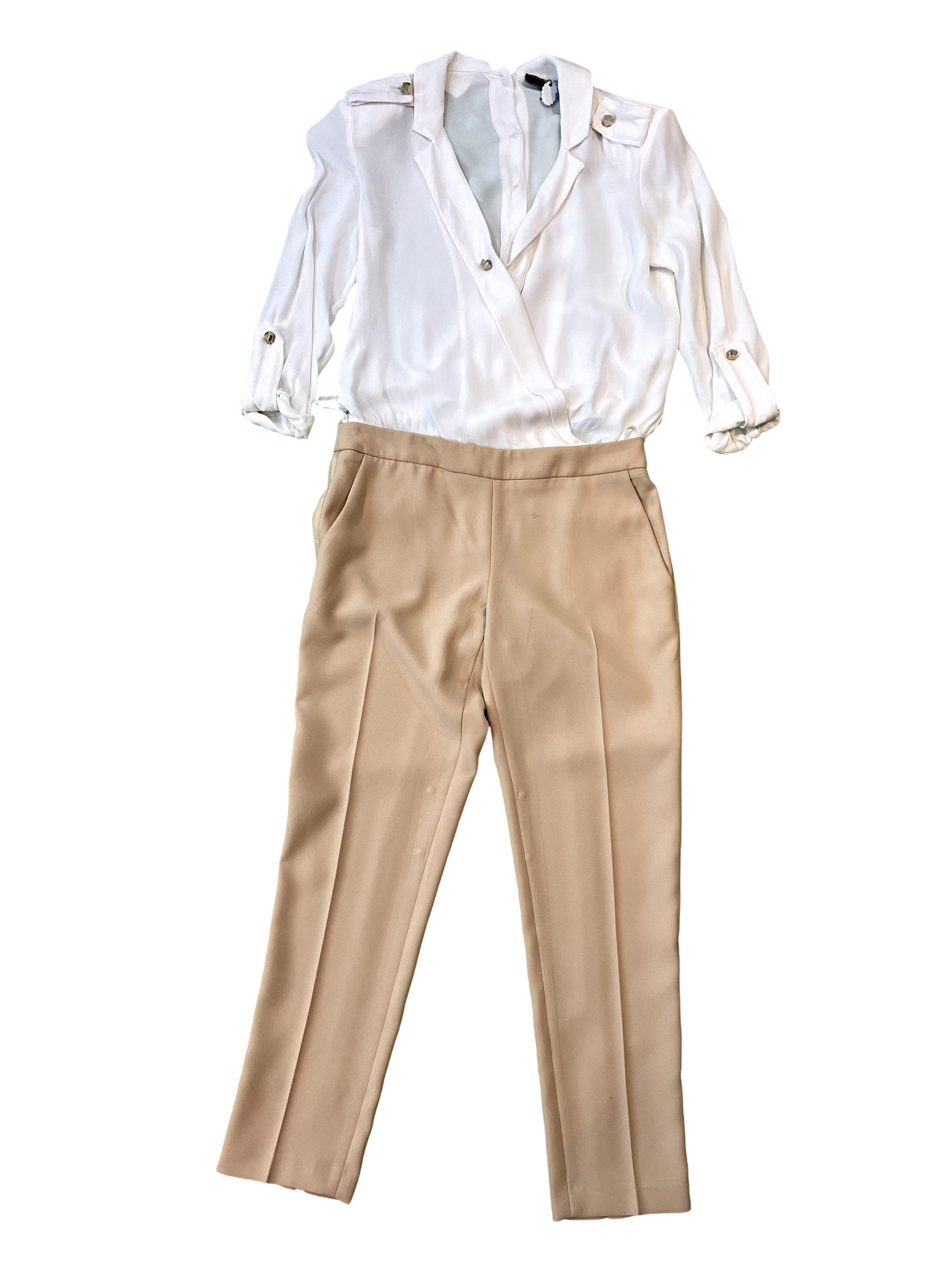 Looks like a white shirt & a beige pants with golden buttons jumpsuit.