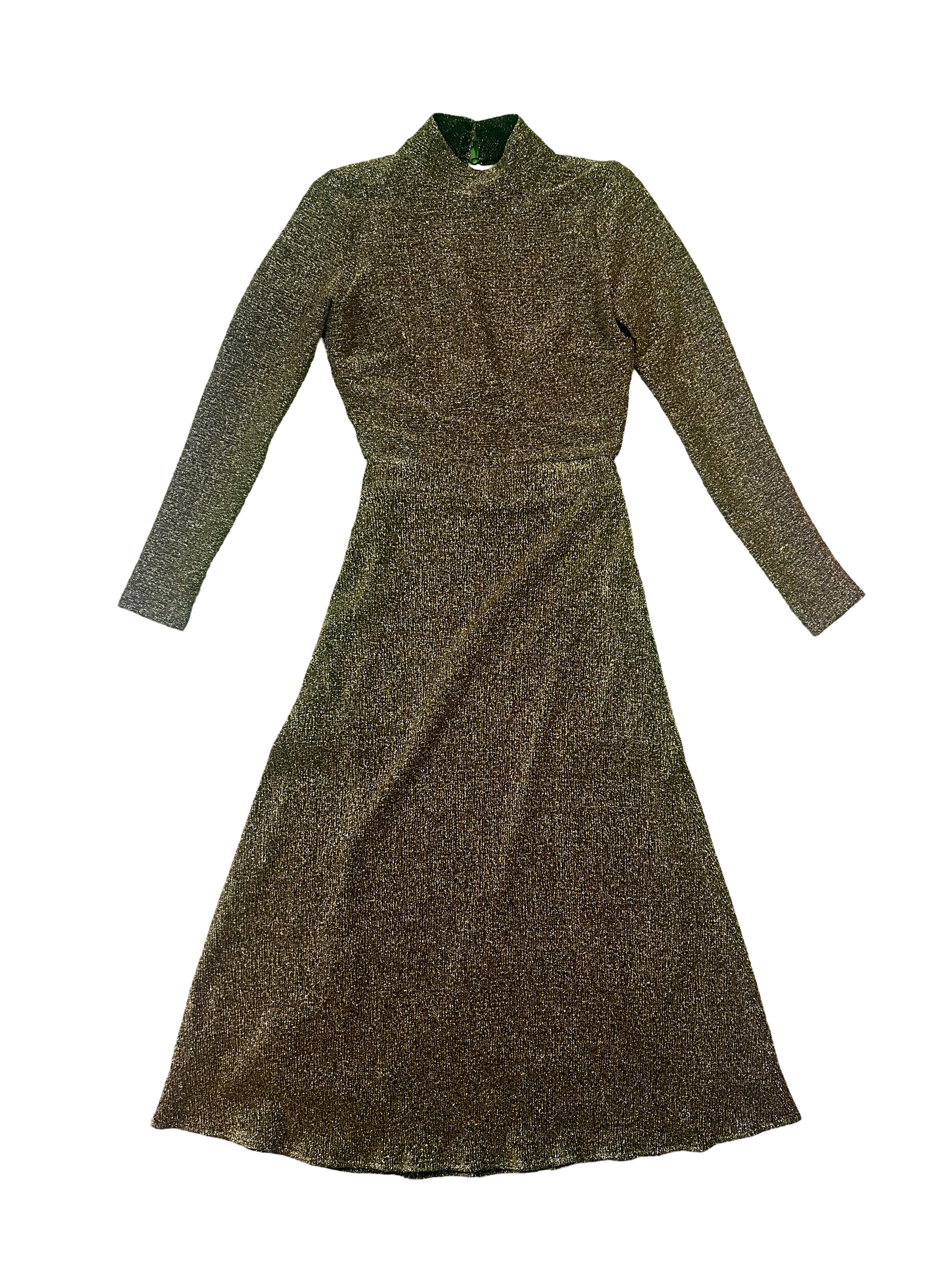 Gold/ black shimirry fabric set. Long A shaped skirt with a long sleeved high colar top but backless charm.