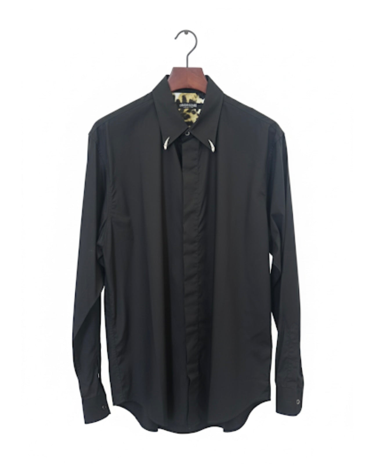 Black shirt with silver accessory detail on the collar & Roberto Cavalli's signature tiger print inside the shirt