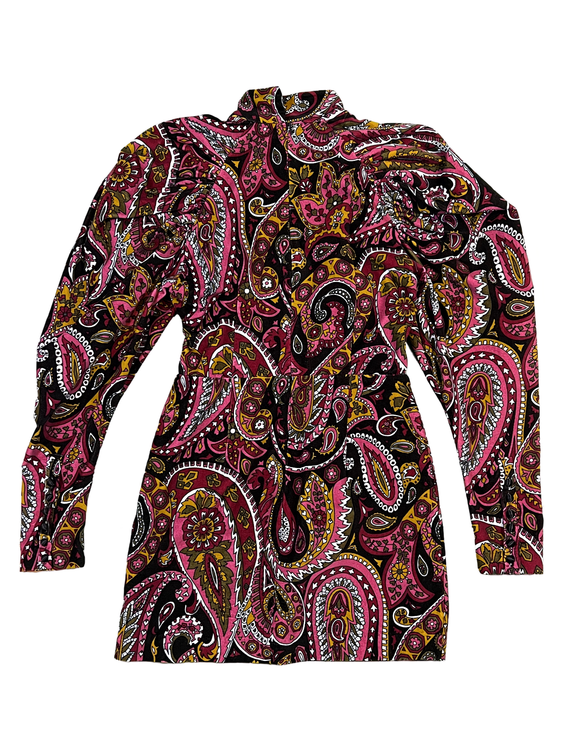 Short dreass, long puffed sleeve. Velvet fabric in winter colored paterns