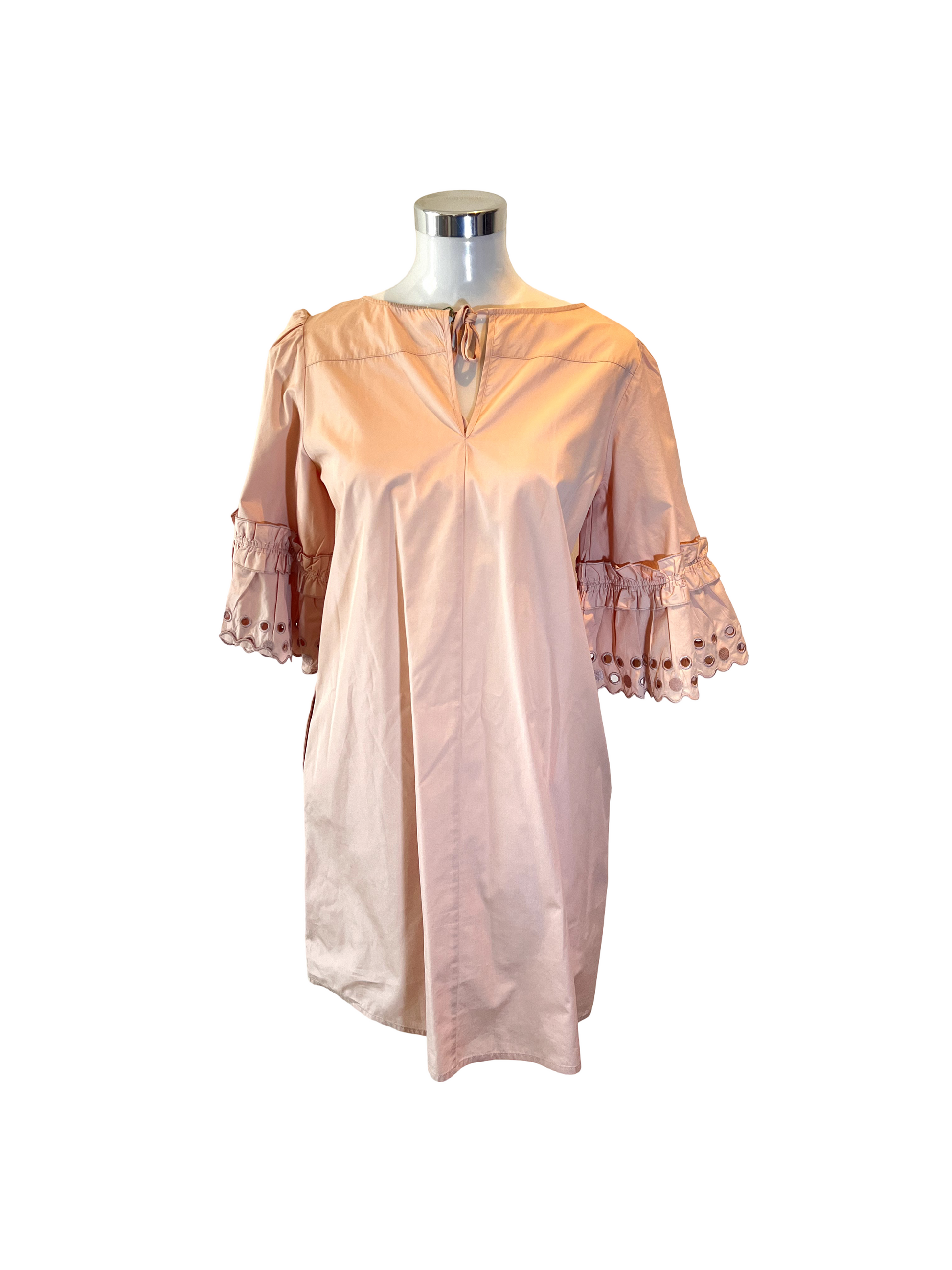 Light pink cotton loose, short dress with raffled short sleeves and a ribbon to tie by the neck.