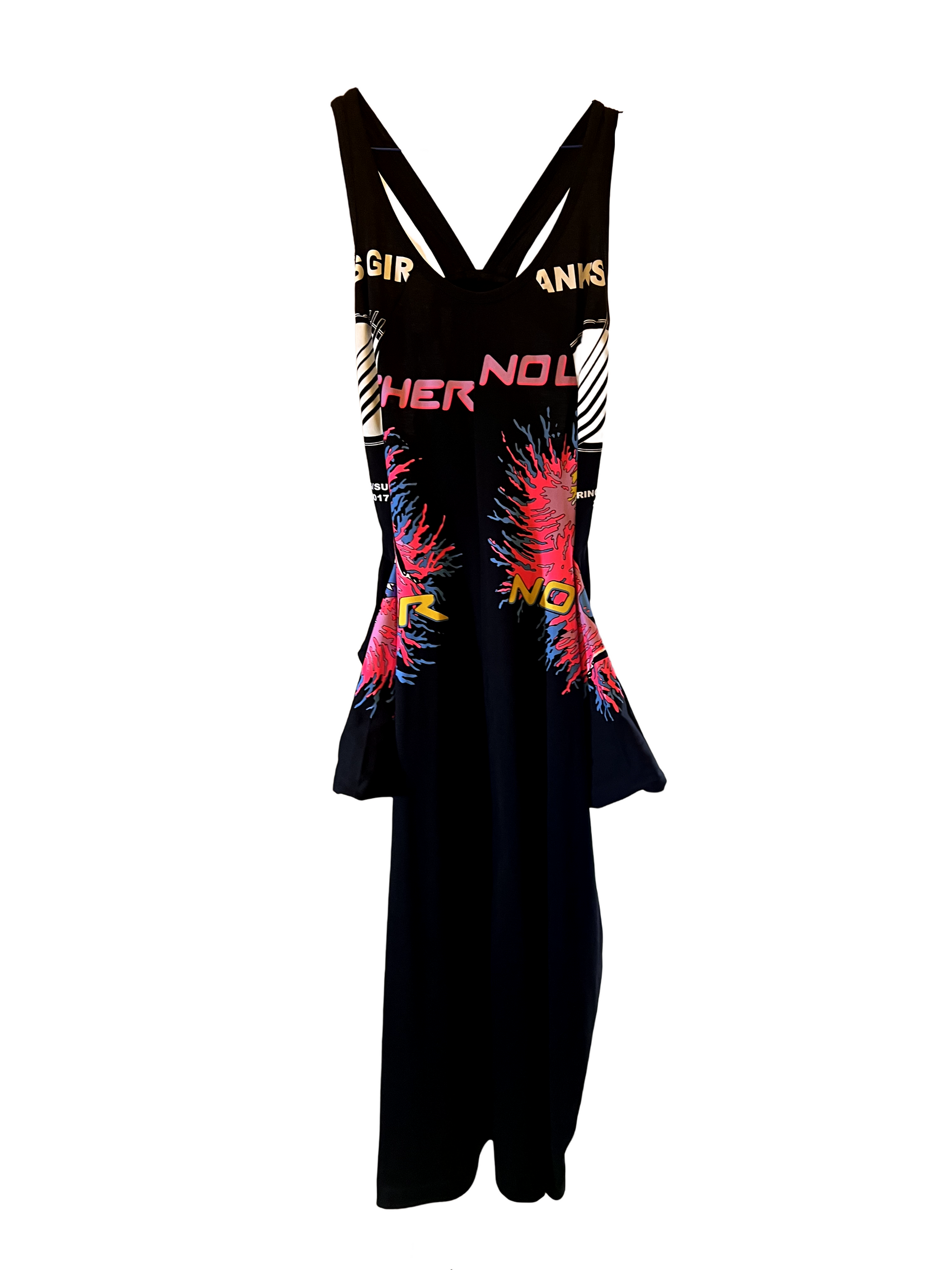 Black cotton long, sleevless casual dress with prints. Suitable for a comfortable day.