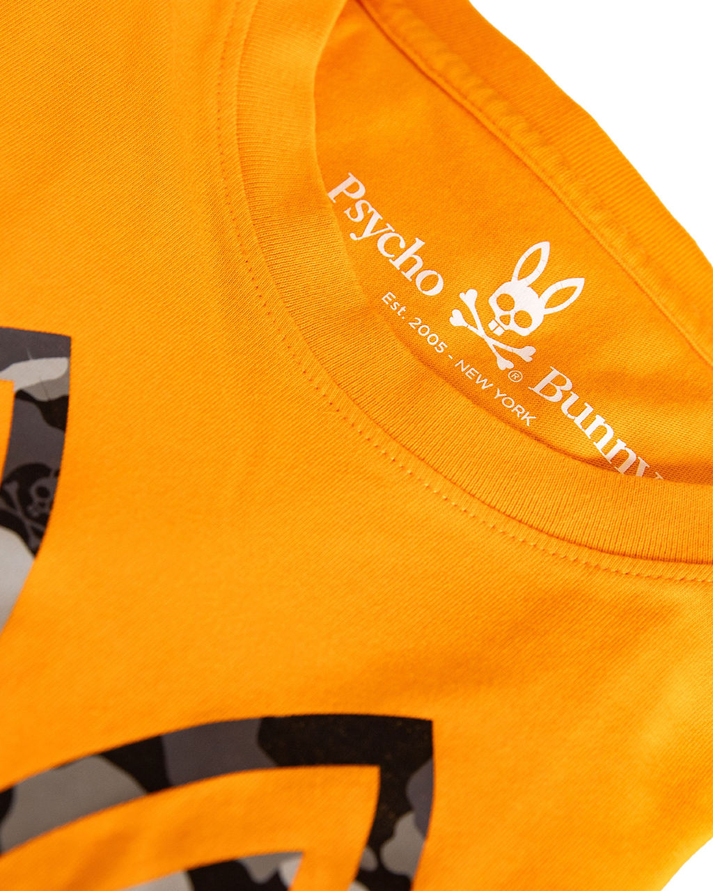 Orange Psycho Bunny tshirt with the signature Psycho Bunny print on the front in faded black print outShare