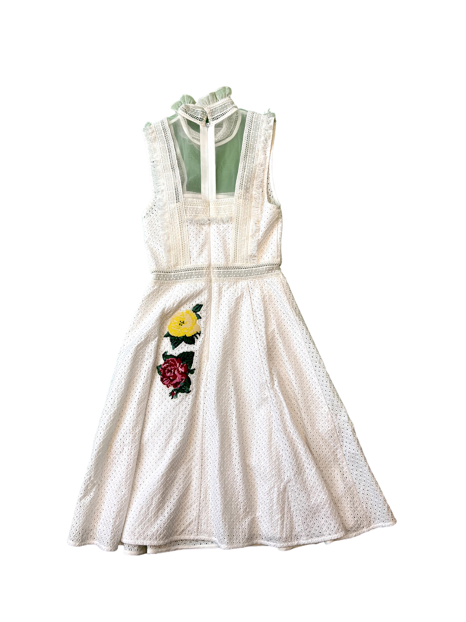White midi dress in elegant rich mixed fabrics with a touch of flowers stitches so suttle. Perfect for any day occasion.
